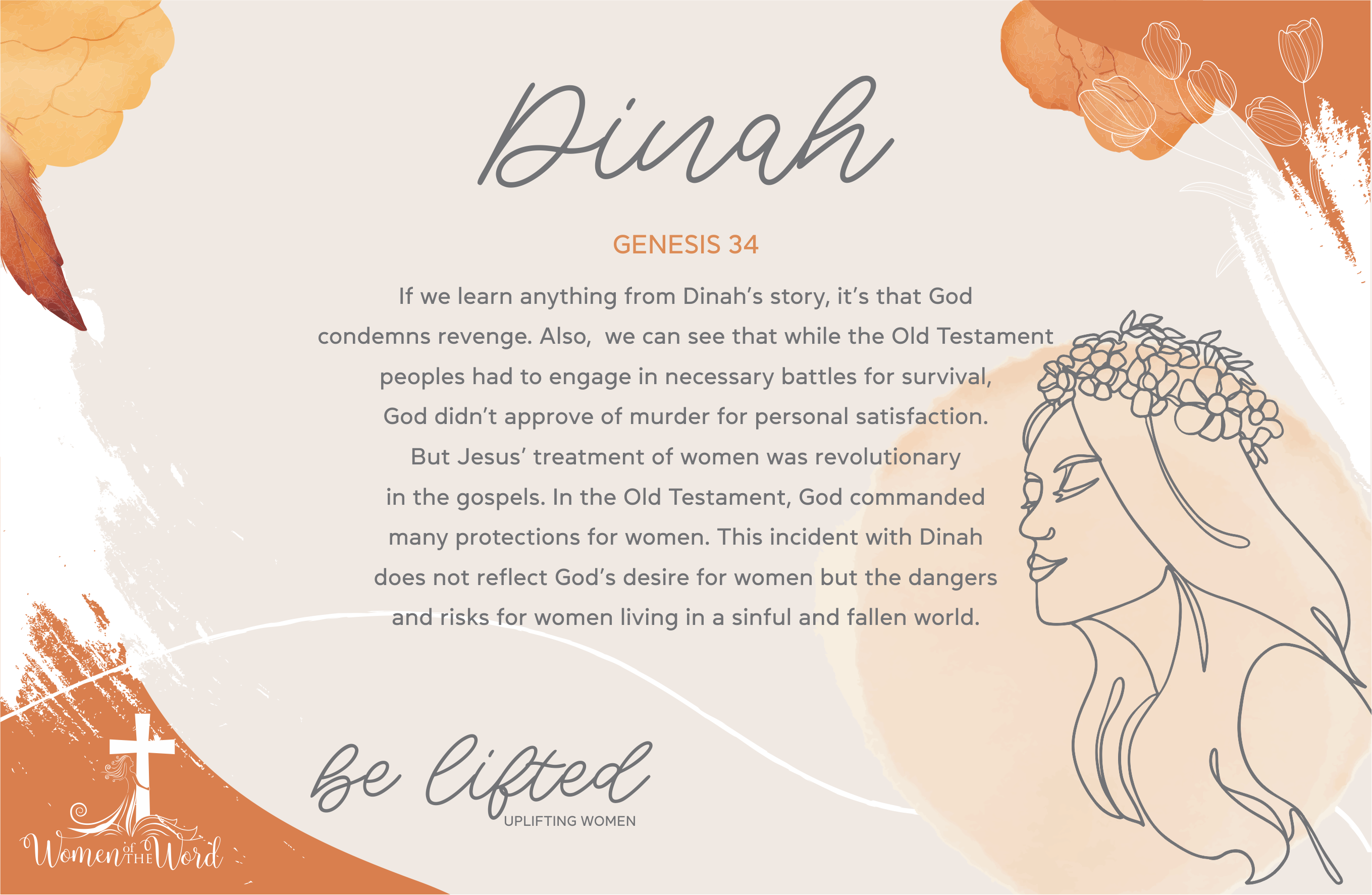Two of Jacob’s eldest sons did not agree with Jacob’s decision.  She was the only girl in the family.  We know how brothers can be overprotective of their sisters.  They were angry and tricked Dinah’s rapist into thinking there would be a marriage. Just to later entrap them and kill the man that raped their sister and all the men in that village.  What did this punishment accomplish? Did this help Dinah in any way? What was her opinion? Did Jacob or his two sons ever consult Dinah and asked her if she would like to marry the man that raped her?  Had her heart softened towards him since he spoke kindly to her and now loves her?  Or did she want wrath and punishment upon this man?  All these plans were made for Dinah without hearing her side, her needs, her wants, and her heart.